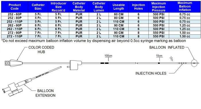 The Angiographic Balloon Catheter is made of extruded radiopaque polymeric tubing with two lumens in the body of the catheter. The inflation lumen at its distal end opens into a latex balloon which is attached to the tapered tip. The injection lumen terminates distally in multiple holes, situated in two rows on opposing sides of the catheter just proximal to the latex balloon.