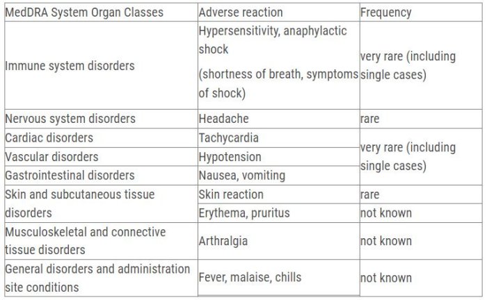 Adverse reactions such as chills, headache, dizziness, fever, vomiting, allergic reactions, nausea, arthralgia, low blood pressure and low back pain may occur occasionally.