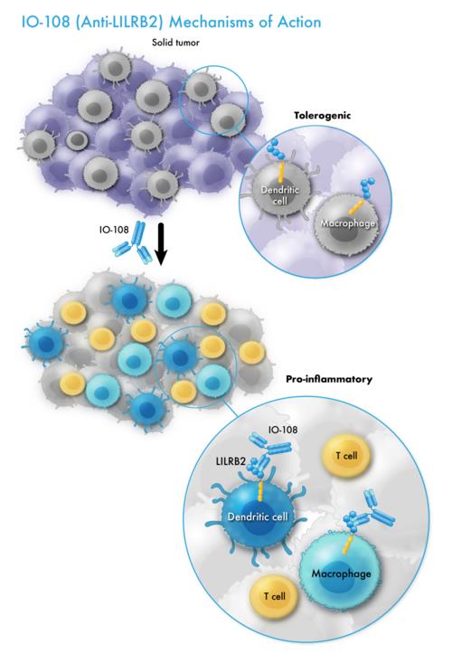 IO-108 is a fully human IgG4 monoclonal antibody with high affinity and specificity towards LILRB2 (also known as ILT4). It blocks the interaction of LILRB2 with multiple ligands that are involved in cancer-associated immune suppression, including HLA-G, ANGPTLs, SEMA4A and CD1d. Preclinical data presented at the 2020 Society for Immunotherapy of Cancer’s annual meeting and the 2022 American Association for Cancer Research annual meeting demonstrate that IO-108 functions as a myeloid checkpoint inhibitor and promotes innate and adaptive anti-cancer immunity.