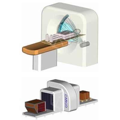 CT scanners consist of an x-ray source opposite an arc-shaped array of detectors. The collimator is located immediately in front of the detectors to protect them from scattered X-rays. Ideally, each detector in a CT scanner measures intensity of X-rays that reach the detector after traveling along a straight-line path from the X-ray source to the detector.