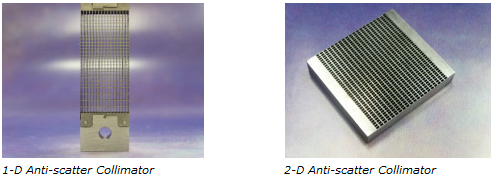 The commonly known anti-scatter collimator is comprised of thin plates formed from a suitable X-ray absorbing material like lead or tungsten. These plates are focused at the x-ray focal spot and generally located between columns of detectors (z-direction) but not between rows of detectors. This collimator is referred to as a "1D" anti-scatter collimator. In multi-slice scanners it has been found more advantageous to have shielding between both columns and rows of detectors; both directions are focusing to the X-ray source. This type is called a "2D" anti-scatter collimator.