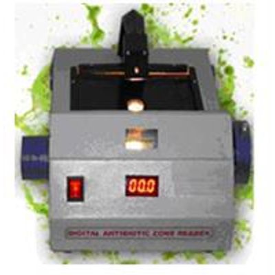 Antibiotic zone reader provides a rapid and accurate method for determining the strength of antibiotic materials by measuring the diameter of an inhibited zone in Petri-dish.