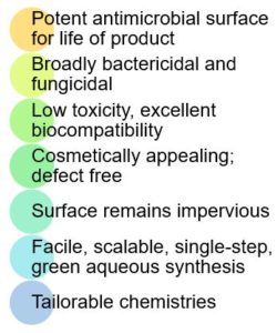 Our platform No. 2 antimicrobial additives can be broadly applicable across medical, consumer and industrial markets. A wide variety of derivatives have been synthesized. In the medical device space silver (Ag+) and quaternary ammonium compounds (QACs) have been explored. Modified acrylic latex enamel paint with various actives has been shown to be extensively antimicrobial, antiviral and antifungal, eradicating >99.99% or more of pathogens. In the last decade, interest in silver nanoparticles (Ag NPs) has increased due to their unique antimicrobial activities. Silver nanoparticles are now the most common commercialized nano-technological product on the market. They are widely used in many products including advanced wound dressings. However, there is an increasing concern related to the biological impact of the use of nanoparticles on a larger global scale, and the possible risks to both human and environmental health.