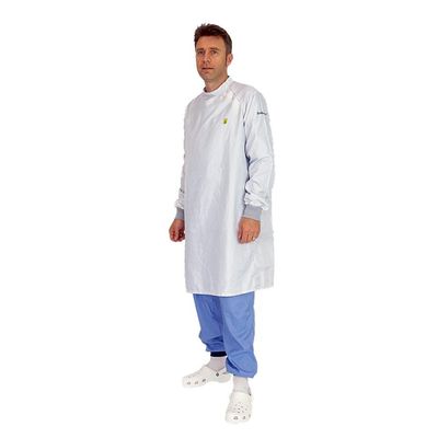 Comfortable apron with no opening for maximum antistatic effectiveness.