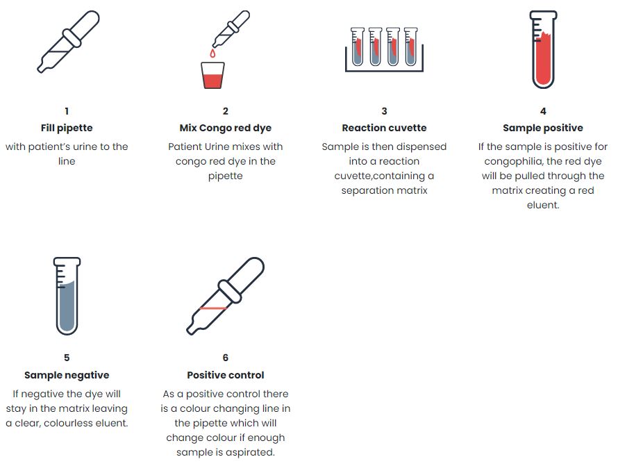 Urine from pregnant women with pre-eclampsia typically contains aggregates of misfolded proteins, which can be selectively bound by Congo red dye (congophilia). When a mixture of Congo red dye and urine from a pregnant woman is loaded onto the separation matrix in a detection cuvette, the presence (positive) or absence (negative) of misfolded proteins can be determined based on the colour of eluate collected in the cuvette. A red eluate colour indicates a positive pre-eclampsia diagnosis, whereas a colourless eluate indicates a negative diagnosis.