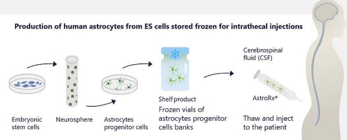 Kadimastem`s innovative approach is to use fully differentiated astrocytes as a regenerative medicine therapy for ALS – AstroRx® to slow the progression of the disease and improve the patient`s life quality and life expectancy. AstroRx® is administered directly into the patient’s spinal cord fluid by a standard intrathecal injection under local anesthesia. Pre-clinical studies in ALS animal models showed that AstroRx® is a safe treatment that provides systemic support to damaged motor neurons, increasing the life expectancy and motor functions.