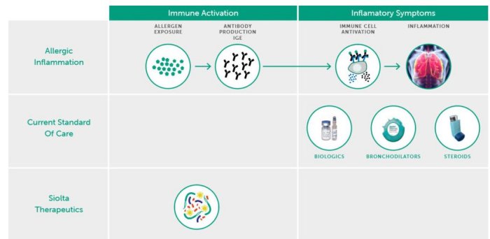 The current standard of care treatments such as antihistamines, steroids, bronchodilators, and biologics, target the downstream inflammation that results from an inappropriate immune response. In contrast, Siolta Therapeutic’s microbiome-based approach towards atopic diseases aims to prevent the initiation of the immune dysfunction cascade, thus preventing allergic disease before it starts. Our preclinical proof of concept studies provide evidence that oral supplementation with STMC-103H has the potential to alter the gut microbiome, reprogram metabolism, reduce immune activation, and thus protect against allergic inflammation.