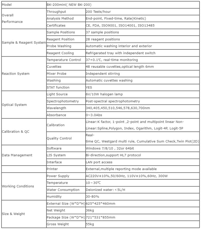 Features: 37 Sample positions. 28 Reagent positions. 48 Reaction cuvettes. 200 Tests per hour. Probe anti-collision function, liquid level dectection function.