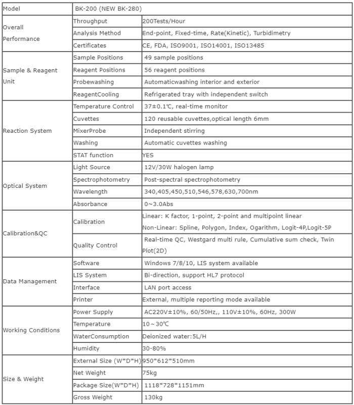 Features: 49 Sample positions. 56 Reagent positions. 120 Reaction cuvettes. 200 tests per hour. Probe with anti-collision function, liquid level dectection function.