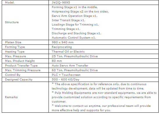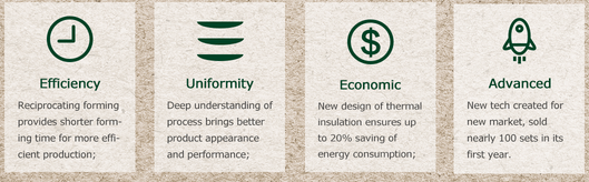 The semi-auto tableware machine is mainly applied for producing pulp molding one time use tableware, premium egg packaging, medical care items, high end industrial packaging products and so on. Pulp molding production line with semi-auto tableware machine as the forming system has the following features: