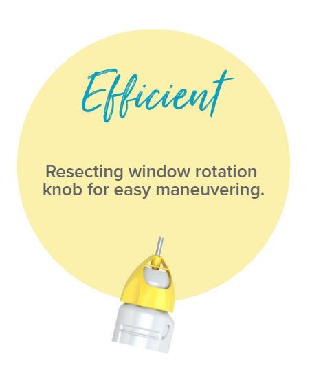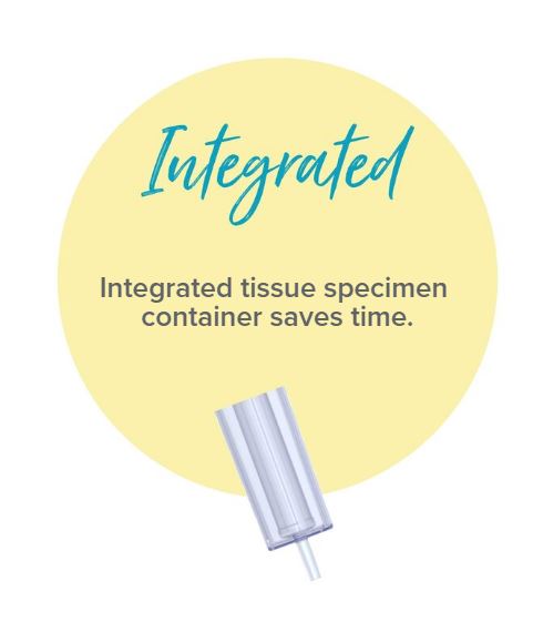 The integrated suction pump within the handle provides a uniform and continuous aspiration that provides efficient soft tissue resection without any hand fatigue. The integrated tissue specimen container can hold up to 4g of tissue for pathology.