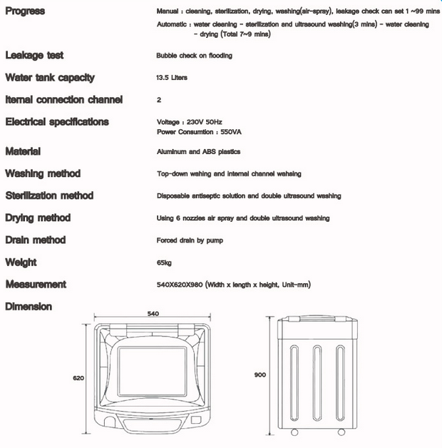 - Cleaning-antiseptic solution sterilization and ultrasonic washing (4 minutes) Sterilization -drying, finalize all of automatic-washing process, takes 7~9 minutes.
