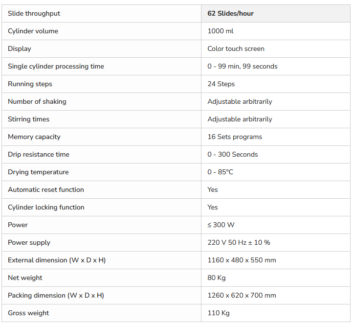 - Used for automated staining of histology and cytology slides in medical, research, and diagnostic laboratories, ensuring consistent staining quality, reduced manual handling, and improved workflow efficiency.