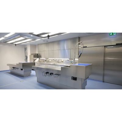 The air is extracted on the underside of the protruding cover, which enables a smooth and easy-to-clean support surface. The gradual arrangement of the basins and the cutting surface with a cutting board ensures ergonomic work for everyone involved in the section. The working height of the autopsy tables can be individually adjusted in a range of approx. 400mm. The arrangement and number of water fittings, sockets and control elements can be designed individually. The size, arrangement and design of the pools is adapted to the requirements of our clients. Our autopsy tables are made entirely of stainless steel 1.4301. The drainage channels are made with hygienic radii on the floor to ensure easy cleaning.