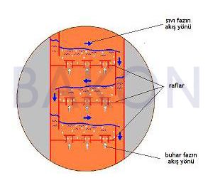 As the liquid flows down, it comes in contact with rising vapor on the plates where mass transfer between the phases takes place in both directions.