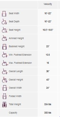 Seat to Floor Height 16.5"-19.5". Adjustable seat width and depth 16"-22". Unoccupied tie downs standard. Center of gravity 0°-55° posterior. Shear reduction recline 90°-150°. Optional power seat lift with 12" of elevation. Tension-adjustable front and rear suspension. LED lights come standard on shroud.