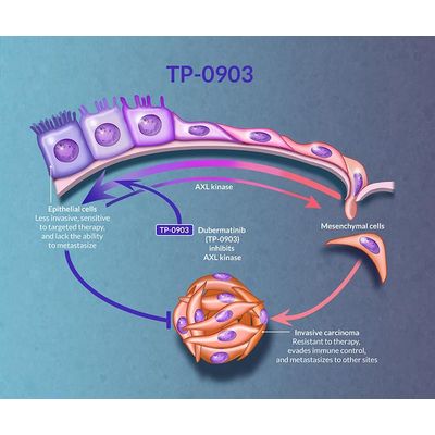 Dubermatinib (TP-0903) is an investigational inhibitor of AXL receptor tyrosine kinase (RTK), a protein known to be involved in acquiring resistance to chemotherapeutics, immune evasion, and developing metastatic capacity in cancer cells.9-11