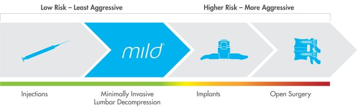 mild® is an early treatment option to consider if more conservative therapies, such as physical therapy or pain medications, are not providing adequate relief. The mild® Procedure addresses a major root cause of LSS by removing excess ligament tissue to restore space in the spinal canal. The mild® Procedure typically takes less than an hour and can be performed through a single, tiny incision smaller than the size of a baby aspirin (5.1 mm).