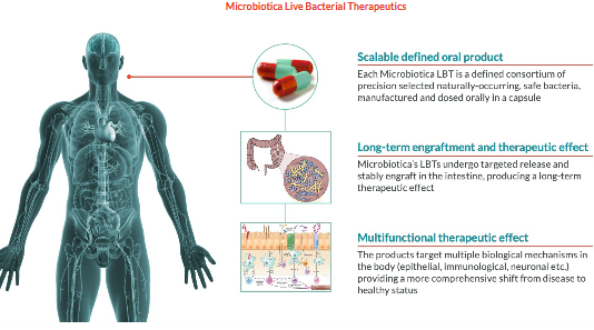 Microbiotica’s best-in-class live bacterial therapeutics (LBT) are defined consortia of precision-selected naturally occurring, safe bacteria, manufactured and dosed orally in a capsule. These LBT undergo targeted release and will stably engraft in the intestine, producing a long-term therapeutic effect. The products target multiple biological mechanisms in the body (epithelial, immunological, neuronal etc.) providing a more comprehensive shirt from disease to healthy status.