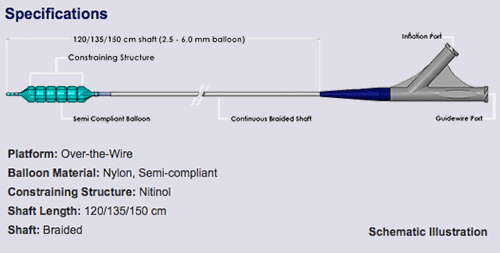 Design: Unique nitinol "constraining structure" (CS) mounted on a semi compliant balloon