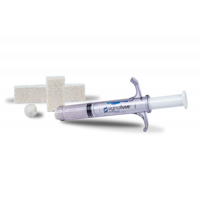 SIGNAFUSE contains a synergistic combination of biomaterials that supports new bone formation. SIGNAFUSE is a synthetic bone graft made up of bioglass and a biphasic mineral (60% hydroxyapatite, 40% β-tricalcium phosphate) available in putty and strip formats.