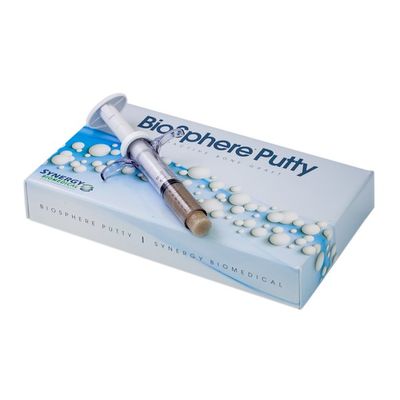 BioSphere Putty is based on an innovative form of 45S5 bioactive glass. The Putty utilizes Synergy`s unique spherical bioactive glass particles with a optimized, bimodal size range. The combination of the BioSphere particles and a resorbable, phospholipid carrier results in a bioactive Putty with the highest bioactive glass content on the market, excellent handling, and improved bone healing..