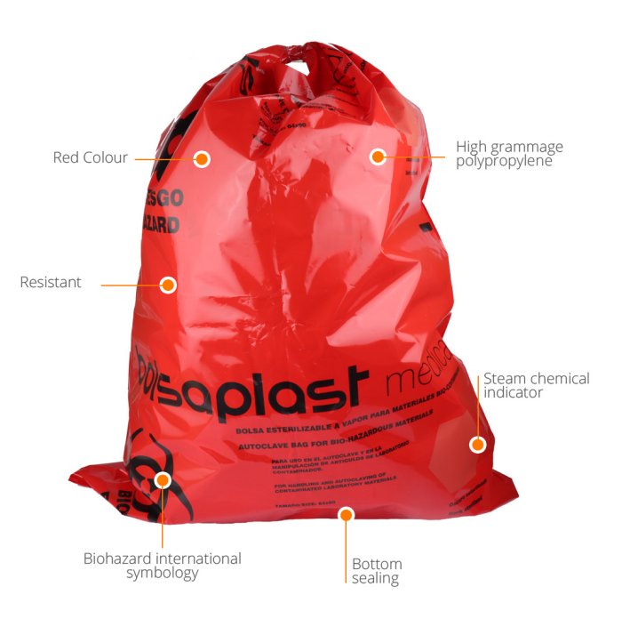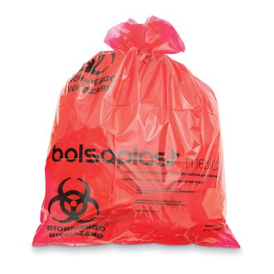 Special security bag made of high-grammage polypropylene. Special security Biohazard Bag made of high-grammage polypropylene. Used for the collection, transport and processing of contaminated materials and products. Thanks to its colour, it is easily recognisable by healthcare personnel, making it easier to use and process. It is a steam process indicator that turns dark when the bag has gone through a sterilisation process. Also included on the bag is the international biohazard symbol to ensure its designed use is easily interpreted. The thick seal at the bottom gives the bag great resistance to tearing and breakage, avoiding the risk of leakages.