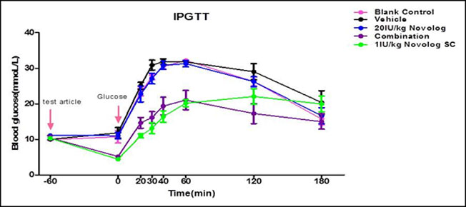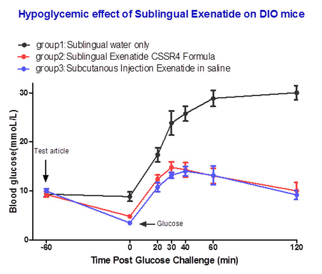 The figure below demonstrates that our sublingual formulation (SL) (Group 2) very closely matches the effectiveness of subcutaneous (SC) (group 3) exenatide in modulating blood glucose levels in diet-induced obese (DIO) mice.