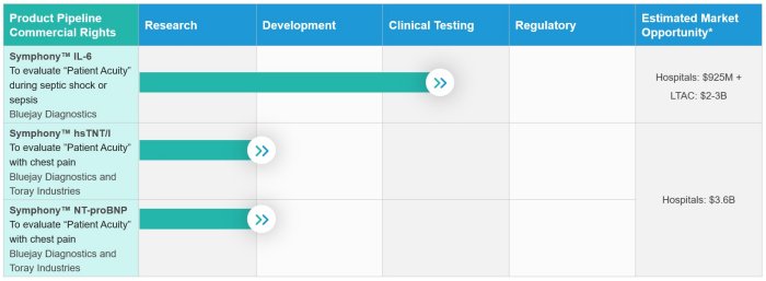 Symphony is an automated diagnostic system, consisting of a fluorescence immuno-analyzer which uses a single-use diagnostic test cartridge with reagents integrated in the cartridge. Symphony utilizes a ‘sample-to-result’ format, which means that once a specimen is taken from the patient, it is placed in the cartridge and then the cartridge is placed inside the analyzer where the test is run without further technician intervention or additional reagent. This reduces test complexity and eliminates the need for highly trained and expensive laboratory technicians to run the tests. Our platform is designed to enable simple, rapid, and cost-effective analysis from a single clinical sample, which will allow LTACs, hospitals and clinics that traditionally could not afford more expensive or complex diagnostic testing platforms to modernize their laboratory testing and provide better patient testing at an affordable cost in time sensitive, life threatening situations.