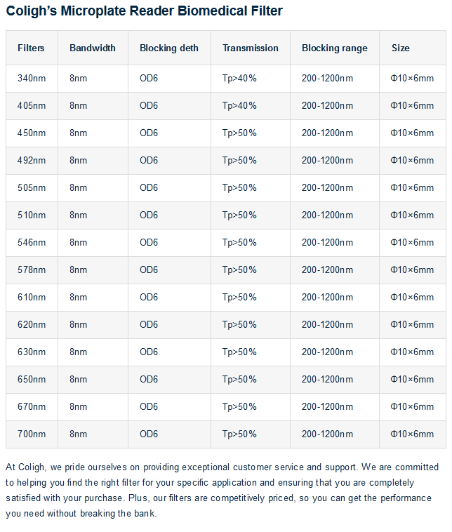 Biomedical filters are used in microplate readers to selectively filter light based on its wavelength, allowing for specific detection and quantification of biomolecules such as proteins, DNA, and RNA. Microplate readers typically use a variety of filters to detect and quantify the absorbance or fluorescence of different biomolecules. The filters are usually located in the filter wheel of the microplate reader, and can be easily switched out depending on the experiment being performed.