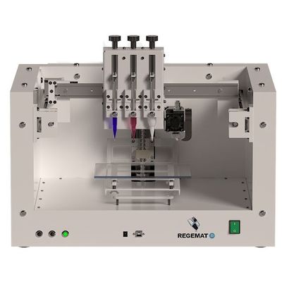 The configuration of the printing head and the wide range of movements in X, Y and Z allow a precise adjustment that allows the system to print on different surfaces. Next, select the tools needed for the materials you will work withs: Our head system allows you to include different syringe modules and tools for any application. The modular extrusion head can be configured with different interchangeable extrusion tools, depending on the nature and intrinsic characteristics of the materials. This allows us to have a head adapted to the needs of the materials to be extrudedr. The printing head can be configured with four different tools with adjustment movement in the X and Y.