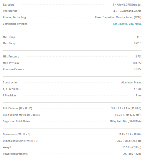 The Allevi 1 is designed for use with the Allevi CORE removable extruder system, which accepts 5mL plastic or metal luer lock syringes and is optimized for all of the bioinks we offer.
