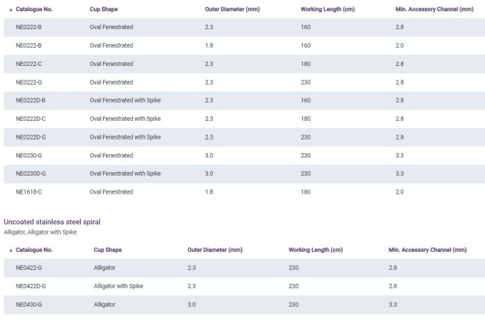 Nucoated or Teflon-coated stainless steel spiral; diameter from 1.8 to 3.0 mm; with and without thorn; oval branches with window; alligator types; total lengths 120cm, 160cm, 230cm and 280cm; handle with finger slider including HF connection.