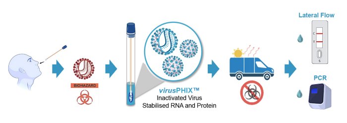 Major deficiencies of current Virus Transport Media (VTM’s) are that they are variously toxic, incompletely inactivate viruses or are poor stabilisers of RNA and proteins, precluding their use for home-testing, transport, storage and safe handling. We have completed development of a solution that uniquely allows the inactivation and preservation of viruses at the point of sampling, whatever the virus and whatever the downstream application. Uniquely, virusPHIX™ is compatible with both nucleic acid (e.g. PCR) and antigen (e.g. Ag lateral flow) based SARS-CoV-2 tests. This buffer also slots faultlessly into your workflow as follows.