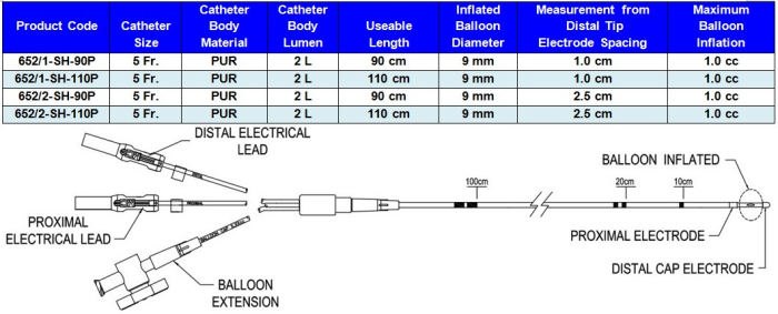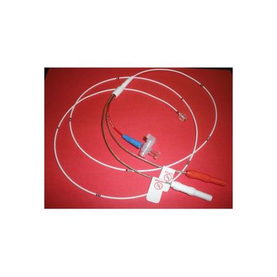 The Bipolar Balloon Pacing Catheter is made of extruded radiopaque polymeric tubing with two lumens and two stainless steel electrodes. Electrode spacing is 1.0 or 2.5 cm apart, depending upon which model you choose. Electrical Pins are covered with read and white shrouded covers.