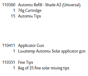 Luxatemp Automix Solar is a high quality bisacryl provisional crown and bridge material dentists love, in an improved light-cure formula. The material starts out rubbery and flexible for ease of use and sculpt, and then light cures on command to form strong, abrasion-resistant provisionals.