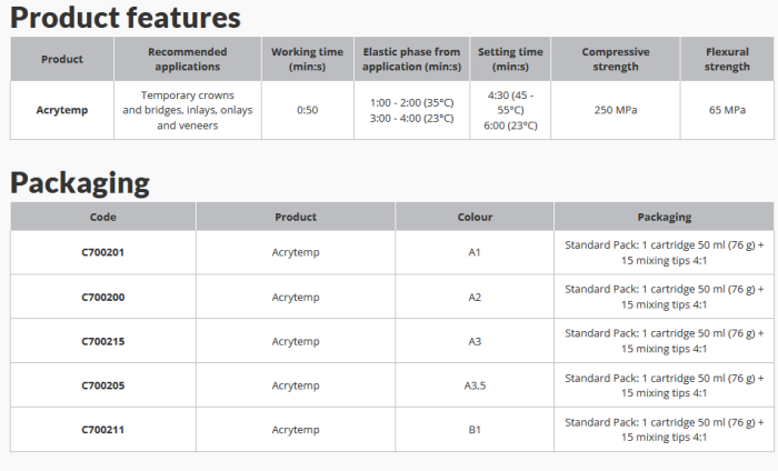 Acrytemp is a bisacrylic self-curing resin for the fast preparation of short and long-term provisional elements. Acrytemp can be used with different working techniques, both for direct and indirect method. It is practical to use, thanks to the self-mixing system, easy to trim and polish, with a high fracture resistance. Its particular formulation is without methyl methacrylate monomer and allows to maintain low temperatures during the setting reaction that does not irritate the pulp. Acrytemp is available in 5 shades and offers a natural aesthetic eff ect that reproduces the colour of teeth, to meet the needs of the patients and of the dentist.