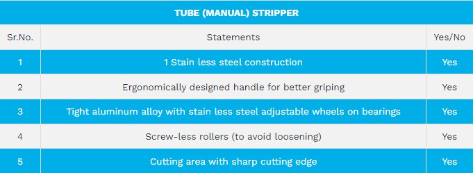 Laboid LBTS-02 is a medical tool used for removing air or liquid from rubber tubes, such as those used for infusion or connecting bags used when blood is collected and processed in a blood bank, its design is like a pair of pliers, but the jaws do not quite close (providing space enough for a flattened, empty tube) and have cylinders that can be rolled along the tube like the mechanism of a peristaltic pump. A stripper may be used, for instance, to move blood that remains in the tube at the end of a blood collection into the bag, thus avoiding wastage.