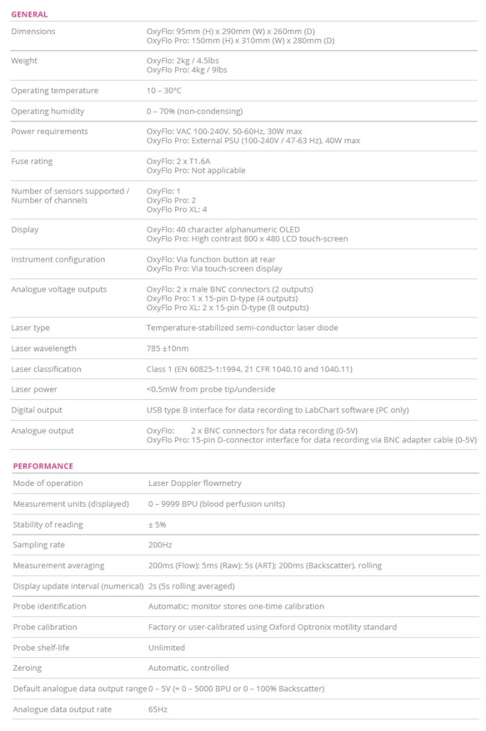 The OxyFlo™ Pro is available as a 2-channel model or, uniquely, as a 4-channel device (OxyFlo™ Pro XL) capable of driving up to 4 probes simultaneously. This provides the flexibility to suit all needs, including the simultaneous monitoring of blood flow from multiple tissue sites (e.g. comparison of pathological versus control tissue sites).