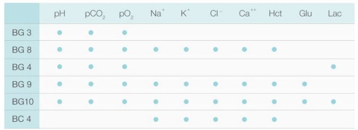 - Multi popular time-sensitive parameters come in one cartridge, including ABG, electrolytes, and metabolites