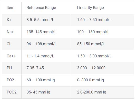 - Measurement Items: PH, PCO2,PO2, Na+,K+, Cl-,Ca2+