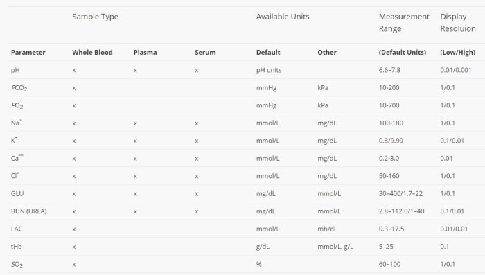 E-GLU Type: pH, PCO2, PO2, tHb, SO2, Na+, K+, GLU