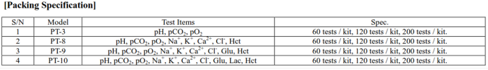 Blood Gas Testing Cartridge (Electrode Method): Integrated Reagent Kit, Including Aspiration Needle?Electrode?Calibrator and Waste Bag. Reagent Kit Store: Normal Temperature(15oC-25oC). Four Kind of Specifications:PT3?PT8?PT9?PT10. Have received CE certif