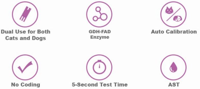 Easy test with one-button operation to test blood glucose for pets at home. Only 0.5 µL blood sample needed, less pain for pets. One meter can be used for testing both cats and dogs. Glucose Dehydrogenase Flavin Adenine Dinucleotide (GDH-FAD) enzyme used. Fresh whole blood (capillary, venous, arterial) can be used for testing for veterinary clinics.