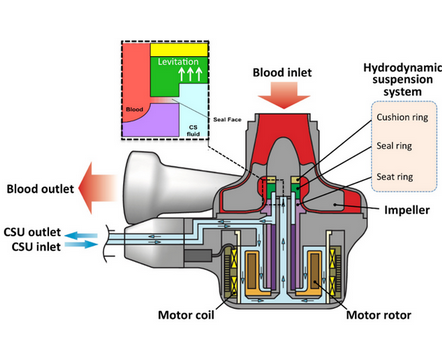 The Hydraulically levitated impeller uses an ultra-thin layer of circulating sterile water which lubricates the mechanical seal interface and cools the area around the shaft to minimize the risk of clot formation. The Open-vane impeller with large flow gaps allow for excellent blood washout and operation at lower speeds to reduce blood sheer. Pump Speed Modulation allows for customizable speed reduction at set intervals to facilitate aortic valve opening.