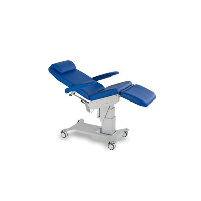3-section medical armchair suitable for examination and blood sampling. The height, the leg section, and the middle section are electrically adjustable. The armchair has comfortable and fully adjustable armrests for blood sampling.