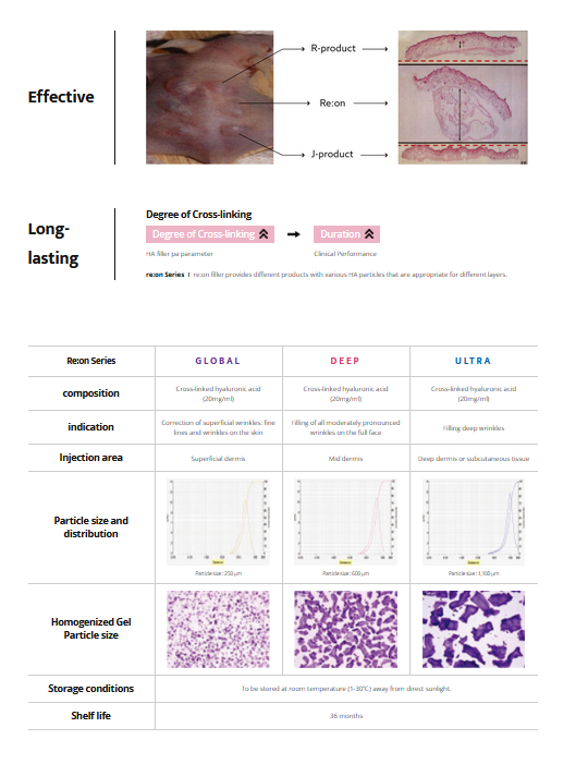 Confirmed amount of residual BDDE in re:on through GC analysis. Protein load: Y product V > R product > Y product C > C product > re:on filler By reducing the amount of protein causing hypersensitivity reaction, it minimizes generation of free radical. Protein Load of re:on is lower than other commercial products.