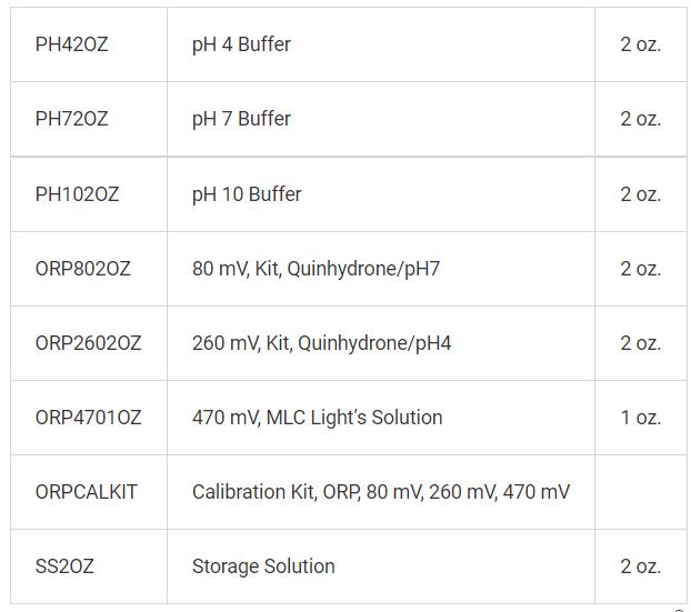 The ULTRAPENx2TM PTBT4 requires pH4, pH7, and pH10 pH Buffer Solutions and 80 mV Quinhydrone, 260 mV Quinhydrone, or 470 mV MLC Light’s ORP Standard Solutions for wet calibration, and Sensor Storage Solution for proper storage.