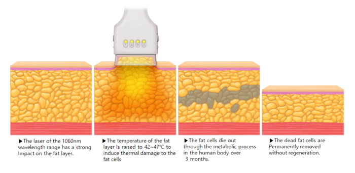 Lipo1060 is a body-slimming equipment using a 1060nm laser, enabling non-invasive procedures without pain. If the fat layer is selectively heated using a 1060nm-laser, the fat cells, which are sensitive to the temperature range of 42~47℃ or higher, die naturally, so that only fat cells are eliminated while the skin is protected.