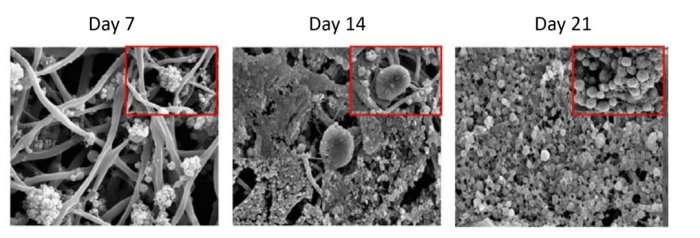 Image: 21-day culture of hMSCs in the PLLA + collagen/HA scaffold, showing mineral deposition on the surface of osteoblast-like cells at day 14 and 21.